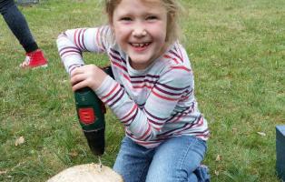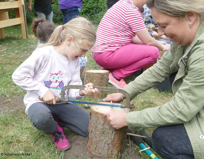 Nach einer Stärkung mit Grillwürstchen und Salat legten die Kinder mit großem Eifer los und sägten, bohrten, feilten und quetschten das vorhandene Material in die benötigte Form.
